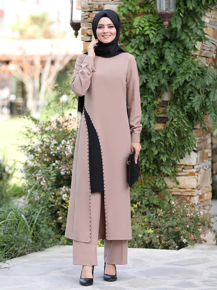 Name: Pantalones tipo túnica para mujer, traje Hijab musulmán combinado, novedad, temporada, con perlas, tela de crepé detallada, pantalones de cintura elástica, Turquía